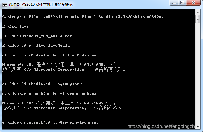nmake -f mediaServer.mak5. 在C:\Program Files (x86)\Microsoft Visual Studio 12.0\Common7\Tools\Shortcuts目录下双击打开” VS2013 x64 本机工具命令提示”,将其定位到E:\live目录下,执行:windows_x64_build.bat,结果如下图所示:四个库可以正常生成,不过testProgs和mediaServer目录下的执行文件总是有问题,报NMAKE : fatal error U1077: “-out:testMP3Streamer.exe”: 返回代码”0x1”,还不知道原因,后面可以通过新建vs工程来生成这些执行文件。