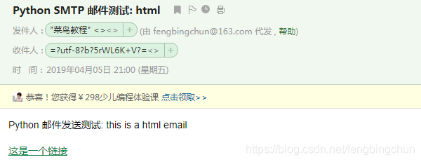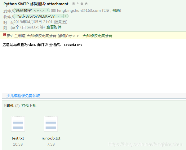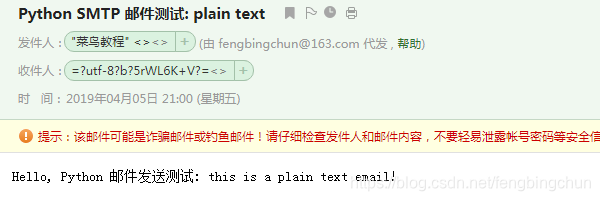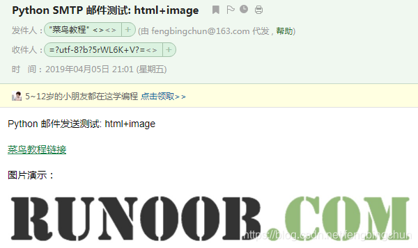 receivers = ["fengbingchun@163.com"] # 接收方def SendTextMessage(text):''' 发送纯文本邮件, text: 邮件内容 ''' # 三个参数:第一个为文本内容,第二个plain设置文本格式,第三个utf-8设置编码message = MIMEText(text, 'plain', 'utf-8') # 邮件内容message['From'] = Header("菜鸟教程", 'utf-8') # 发送者message['To'] = Header("测试", 'utf-8') # 接收者subject = 'Python SMTP 邮件测试: plain text' # 邮件主题message['Subject'] = Header(subject, 'utf-8')try:smtpObj = smtplib.SMTP()smtpObj.connect(mail_host, mail_port)smtpObj.login(mail_user, mail_pass) smtpObj.sendmail(sender, receivers, message.as_string())print("邮件发送成功: plain text")except smtplib.SMTPException:print("Error: 无法发送邮件, plain text")def SendHtmlMessage():''' 发送html邮件 '''mail_msg = """<p>Python 邮件发送测试: this is a html email</p><p><a href="http://www.runoob.com">这是一个链接</a></p>"""message = MIMEText(mail_msg, 'html', 'utf-8')message['From'] = Header("菜鸟教程", 'utf-8')message['To'] = Header("测试", 'utf-8')subject = 'Python SMTP 邮件测试: html'message['Subject'] = Header(subject, 'utf-8')try:smtpObj = smtplib.SMTP()smtpObj.connect(mail_host, mail_port)smtpObj.login(mail_user, mail_pass) smtpObj.sendmail(sender, receivers, message.as_string())print("邮件发送成功: html")except smtplib.SMTPException:print("Error: 无法发送邮件, html")def SendAttachmentMessage():''' 发送带附件的邮件 '''message = MIMEMultipart()message['From'] = Header("菜鸟教程", 'utf-8')message['To'] = Header("测试", 'utf-8')subject = 'Python SMTP 邮件测试: attachment'message['Subject'] = Header(subject, 'utf-8')# 邮件正文内容message.attach(MIMEText('这是菜鸟教程Python 邮件发送测试: attachment', 'plain', 'utf-8'))# 构造附件1,传送当前目录下的 test.txt 文件att1 = MIMEText(open('test.txt', 'rb').read(), 'base64', 'utf-8')att1["Content-Type"] = 'application/octet-stream'# 这里的filename可以任意写,写什么名字,邮件中显示什么名字att1["Content-Disposition"] = 'attachment; filename="test.txt"'message.attach(att1)# 构造附件2,传送当前目录下的 runoob.txt 文件att2 = MIMEText(open('runoob.txt', 'rb').read(), 'base64', 'utf-8')att2["Content-Type"] = 'application/octet-stream'att2["Content-Disposition"] = 'attachment; filename="runoob.txt"'message.attach(att2)try:smtpObj = smtplib.SMTP()smtpObj.connect(mail_host, mail_port)smtpObj.login(mail_user, mail_pass) smtpObj.sendmail(sender, receivers, message.as_string())print("邮件发送成功: attachment")except smtplib.SMTPException:print("Error: 无法发送邮件: attachment")def SendHtmlImageMessage():''' 发送带html+image的邮件 '''msgRoot = MIMEMultipart('related')msgRoot['From'] = Header("菜鸟教程", 'utf-8')msgRoot['To'] = Header("测试", 'utf-8')subject = 'Python SMTP 邮件测试: html+image'msgRoot['Subject'] = Header(subject, 'utf-8')msgAlternative = MIMEMultipart('alternative')msgRoot.attach(msgAlternative)mail_msg = """<p>Python 邮件发送测试: html+image</p><p><a href="http://www.runoob.com">菜鸟教程链接</a></p><p>图片演示:</p><p><img src="cid:image1"></p>"""msgAlternative.attach(MIMEText(mail_msg, 'html', 'utf-8'))# 指定图片为当前目录fp = open('test.png', 'rb')msgImage = MIMEImage(fp.read())fp.close()# 定义图片 ID,在 HTML 文本中引用msgImage.add_header('Content-ID', '<image1>')msgRoot.attach(msgImage)try:smtpObj = smtplib.SMTP()smtpObj.connect(mail_host, mail_port)smtpObj.login(mail_user, mail_pass) smtpObj.sendmail(sender, receivers, msgRoot.as_string())print("邮件发送成功: html+image")except smtplib.SMTPException:print("Error: 无法发送邮件: html+image")if __name__ == "__main__":SendTextMessage("Hello, Python 邮件发送测试: this is a plain text email!")SendHtmlMessage()SendAttachmentMessage()SendHtmlImageMessage() print("finish")