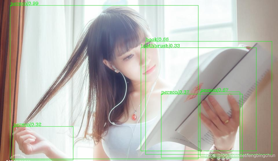 python test_faster_rcnn_r50_fpn_1x.py训练数据集是COCO,共分为80类,包括:person, bicycle, car, motorcycle, airplane, bus, train, truck, boat, traffic_light, fire_hydrant, stop_sign, parking_meter, bench, bird, cat, dog, horse, sheep, cow, elephant, bear, zebra, giraffe, backpack, umbrella, handbag, tie, suitcase, frisbee, skis, snowboard, sports_ball, kite, baseball_bat, baseball_glove, skateboard, surfboard, tennis_racket, bottle, wine_glass, cup, fork, knife, spoon, bowl, banana, apple, sandwich, orange, broccoli, carrot, hot_dog, pizza, donut, cake, chair, couch, potted_plant, bed, dining_table, toilet, tv, laptop, mouse, remote, keyboard, cell_phone, microwave, oven, toaster, sink, refrigerator, book, clock, vase, scissors, teddy_bear, hair_drier,toothbrush。