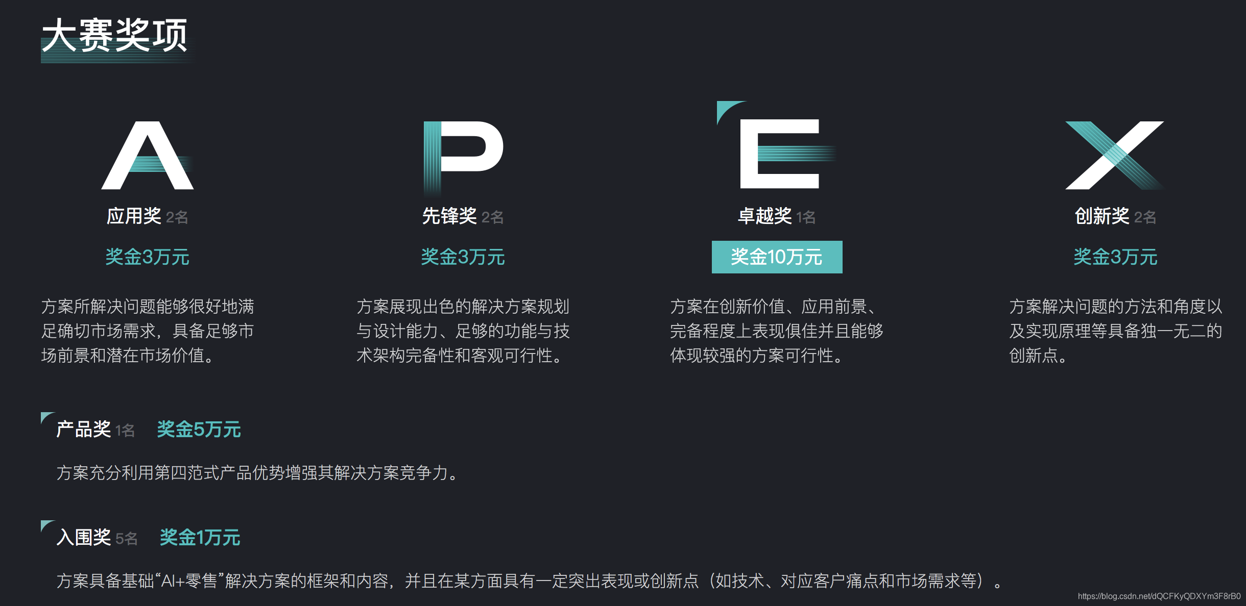 本次比赛共设置应用奖、先锋奖、卓越奖、创新奖4类大奖,分别从创新价值、技术可行性、应用前景、完备程度等方面进行评判。此外,针对利用第四范式产品增强其解决方案竞争力的优秀项目,大赛特设产品奖一名;另大会设置多名入围奖,以鼓励参赛者勇于创新的思维和行动。部分获奖项目有可能获得国内顶级VC投资的机会。