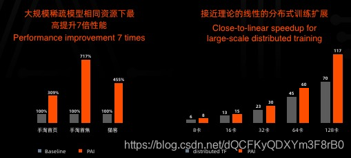- 在飞天AI平台中,高性能的训练和推理引擎框架是非常重要的核心能力,机器学习PAI向我们透露了一些性能指标,比如在分布式训练在相同资源的最高提升了7倍,并且具有良好的线性扩展能力;通过资源调度能力优化集群提升了GPU 30% 使用效率