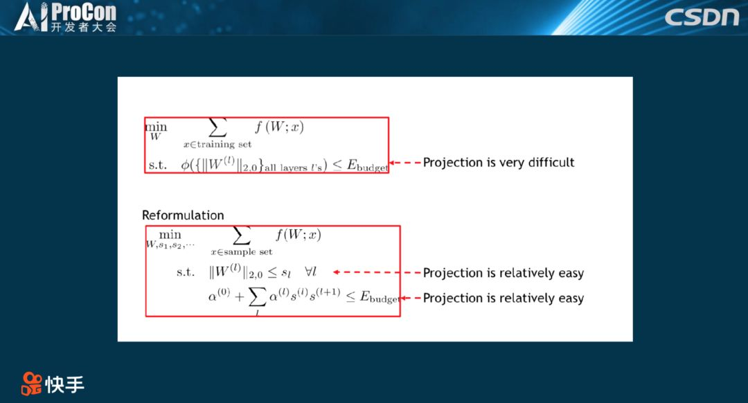 这么做肯定会有困难,问题是可以做成这样的形式,最小化的问题是我们在一个训练集上训练这个模型,底下的约束是我们需要在训练这个模型的同时,使这个模型满足某个能耗的约束,有两个关键的问题是,我们如何看这样的能耗约束以及在这样的约束下如何处理训练的问题。