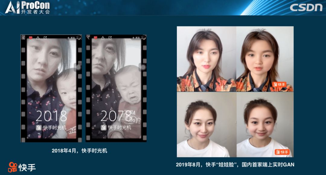 这两个例子是去年上线的一个快手时光机可以通过现在的样子看到60年后的样子。今年8月份Y-tech北京团队上线了一个快手的娃娃脸,快手娃娃脸是国内首家实现端上实时GAN,从技术的层面讲变老是比较容易的,变年轻是比较难的,跟现实生活是一样的。为什么变老比较容易?它不需要改变整体的形状,只需要在脸上加上一些元素,变年轻需要通过对抗生成网络的技术改变脸部整体的信息。