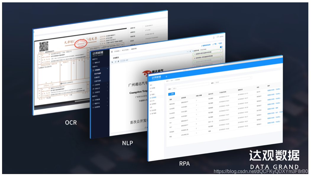 2019 年7月 26 日,业界领先的人工智能企业达观数据在北京召开“达道至简”为主题的产品发布会,正式推出国内首款自主研发集OCR(光学字符识别)与 NLP(自然语言处理)于一体的达观智能RPA。达观数据创始人兼CEO陈运文、副总裁金克、贾学锋和联合创始人高翔携手中国信息通信研究院副总工程师、中国人工智能产业发展联盟副秘书长王爱华、民生科技首席数据科学家李振、中信建投债券承销部高级副总裁夏义鹏、安永财务咨询服务合伙人欧阳伟基、思迈特软件 CEO吴华夫等行业领袖展开演讲和讨论,数百位来自金融、政府、制造及人工智能行业的专家共同见证达观智能 RPA的诞生。