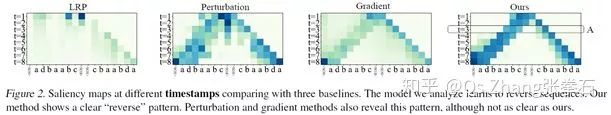 下图比较了不同可视化方法在分析“reverse sequence”神经网络中层特征关注点的区别。我们基于输入单词信息量的方法,可以更加平滑自然的显示神经网络内部信息处理逻辑。