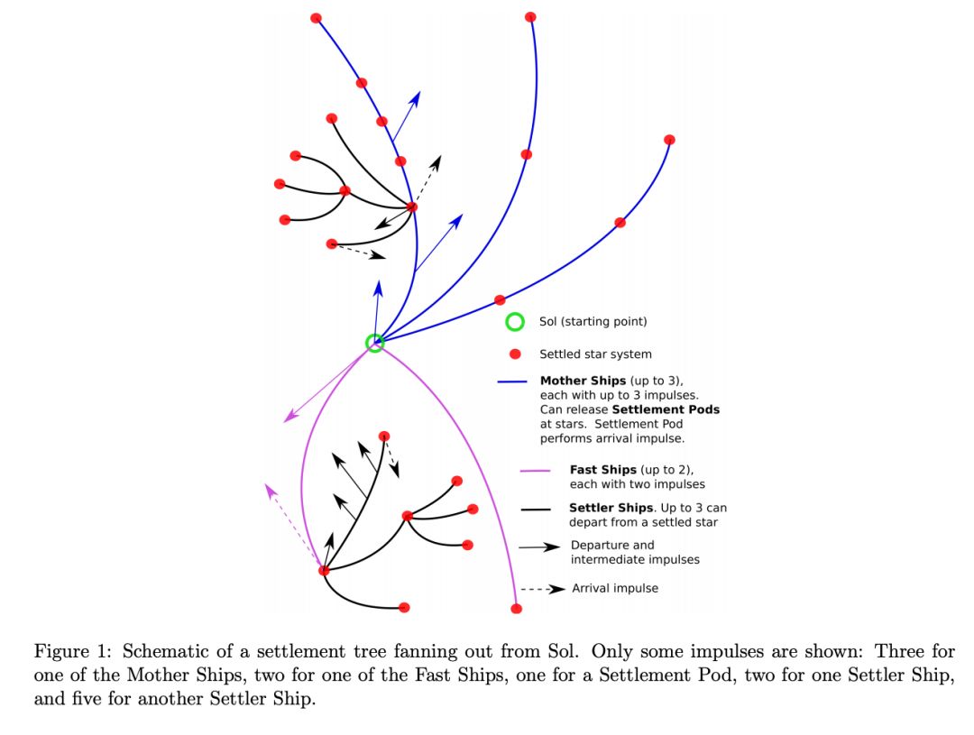 “基于已确认存在有10万个适合生存的恒星系统,优选可移民的星系”,命题看似脑洞大开,实际上要解决的是太空运行轨道的设计问题。在题目中,中心力定律(The central-force law)控制着恒星和船只的运动。 恒星的星历表可以通过分析获得,因为它们被认为遵循圆形轨道运动。 假设竞争的中心力定律近似模拟了银河系中实际恒星观测到的圆周运动。具体而言,圆形轨道速度 Vc,对于距离银河系中心半径为 r 的物体,以及指向朝向银河系中心的加速度 f 的计算公式为:
