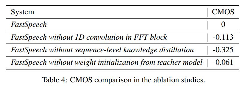 我们也比较了FastSpeech中一些重要模块和训练方法(包括FFT中的一维卷积、序列级别的知识蒸馏技术和参数初始化)对生成音质效果的影响,通过CMOS的结果来衡量影响程度。由下表可以看出,这些模块和方法确实有助于我们模型效果的提升。