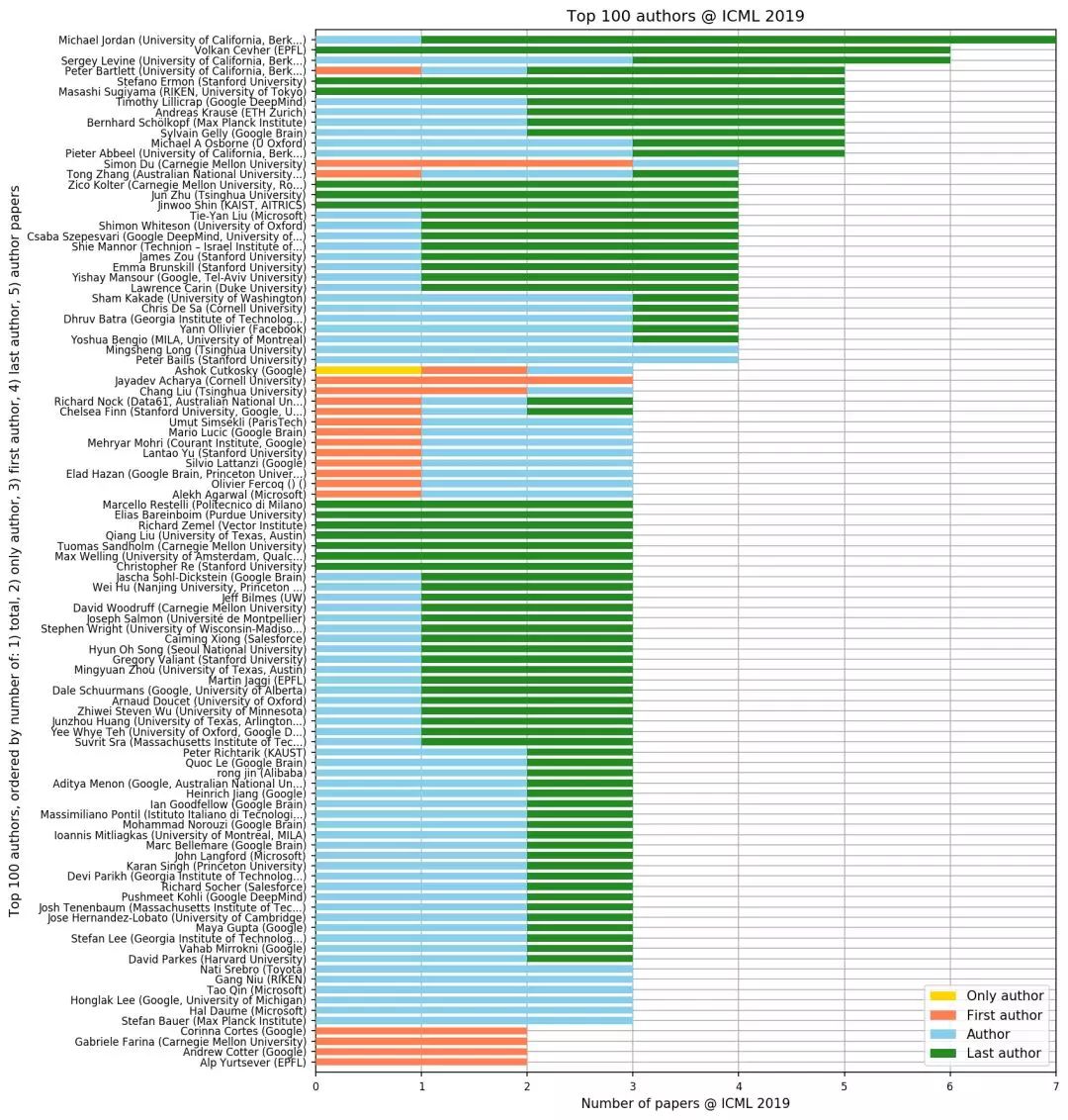 另外,考虑到实验室或研究团队的领头人一般都为论文的最后一名署名作者,为了解机器学习领域的资深研究者,博世对最后一名作者的情况进行了可视化,如下图。
