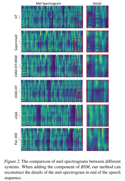 为了研究我们方法中每个模块的有效性,我们通过逐步将每个模块添加到基线(Pair-200)系统进行对比研究。实验中先后添加了以下模块:去噪自编码器(DAE)、对偶变换(DT)和双向序列建模(BSM),结果如下表所示。可以看到,随着更多模块的加入,TTS的MOS得分以及ASR的PER都稳定地提高,显示出各个模块的重要性。