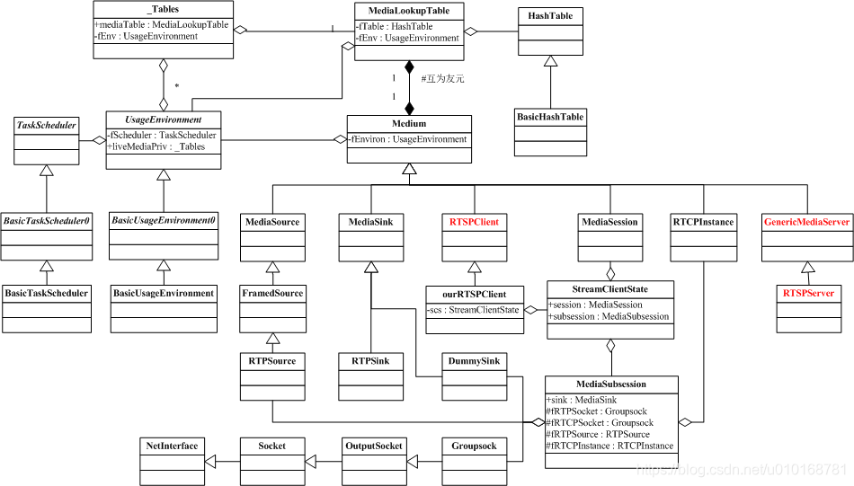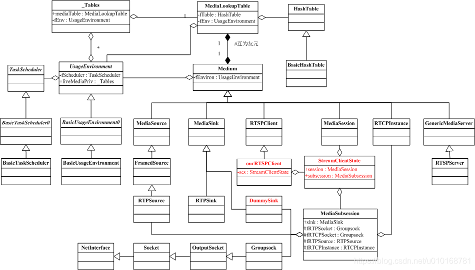 【Live555】live555源码详解系列笔记 继承协作关系图 下面红色表示本博客将要介绍的三个类所在的位置: GenericMediaServer、RTSPServer、RTSPClient 14、GenericMediaServer GenericMediaServer 继承自 Medium,依赖关系图如下: 使用 GenericMediaServer 的关系图: