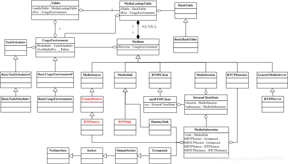 【Live555】live555源码详解系列笔记 继承协作关系图 下面红色表示本博客将要介绍的三个类所在的位置: FramedSource、RTPSource、RTPSink 11、FramedSource FramedSource 继承自 MediaSource,下面是实现 FramedSource 的依赖关系图 使用 FramedSource 的关系图