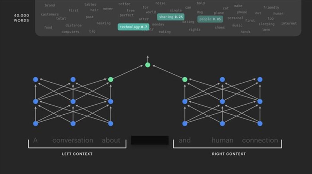 给出一个像“A conversation about ________ and human connection”这样的短句,人们可以很容易地猜出几个可以填补空白的词,但是这项任务对 AI 来说更具挑战性。这是一个有用且可扩展的训练任务的基础,类似于 Google 同时引入的 BERT 模型来解决任务。我们可以依次清空一个句子的每个单词,并对十亿个单词重复这个过程,这个过程当然无需标记。