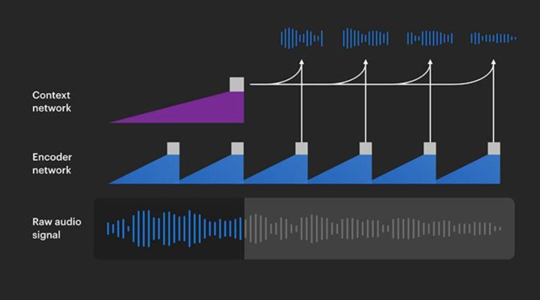 在使用两个卷积神经网络对原始的、未标记的音频数据进行预训练模型后,系统优化后以解决一项越来越困难的任务:预测不同时间的音频,箭头表示未来进一步的预测。
