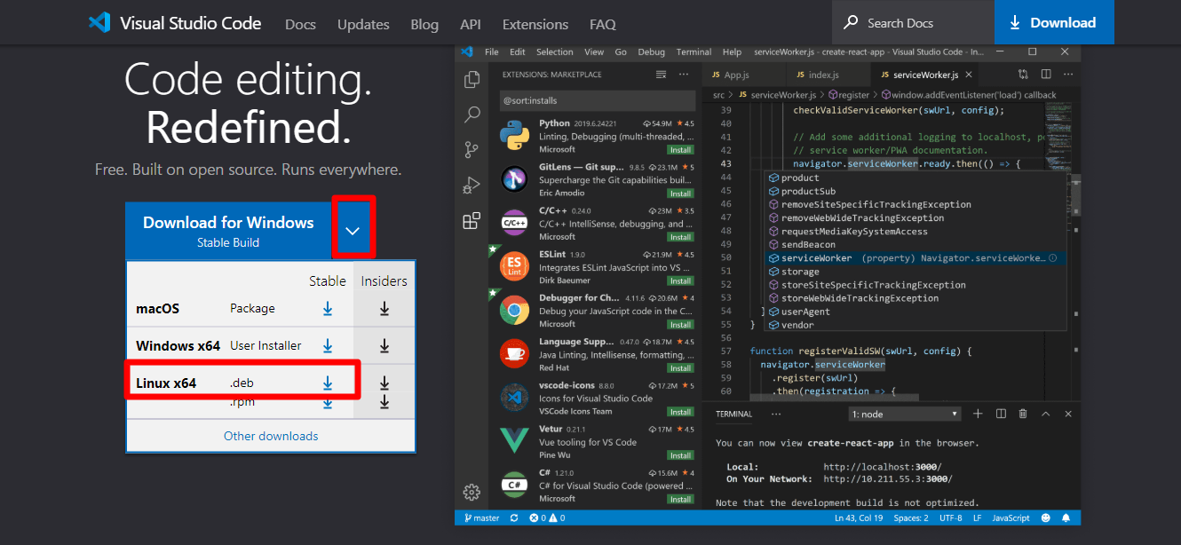 一、安装vscode vscode官网(https://code.visualstudio.com/)下载linux deb文件 下载deb后,使用dpkg -i 命令安装 sudo dpkg -i code_1.45.1-1589445302_amd64.deb在终端执行命令code来启动vscode 二、安装nodejs curl -sL https://deb…