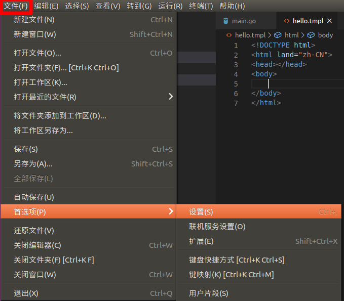 1、打开设置界面 依次点击:“文件” --> “首选项” --> “设置” 2、打开文件配置 依次点击:“文本编辑器” --> “文件” --> “在settings.json中编辑” 3、添加对tmpl后缀文件的html语法自动补全支持 4、效果 html关键字高亮显示…