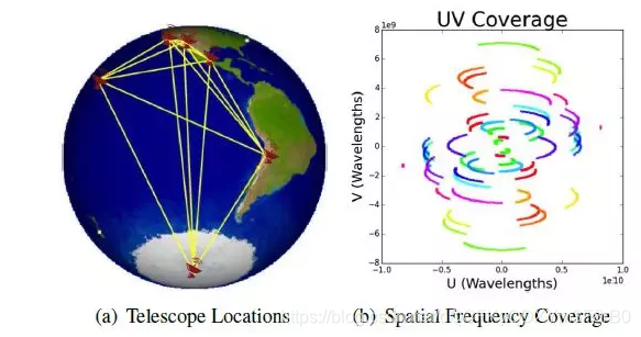 图1 频率覆盖图。(a) EHT 中望远镜位置示意图。通过观测某一天所发射的信号,得到所对应的源图像频率平面的椭圆轨迹。(b) 这些频率 (u, v) 是预计投射的基线位置,其长度垂直于望远镜对的视线。相同颜色的点对应于相同望远镜对的测量值。