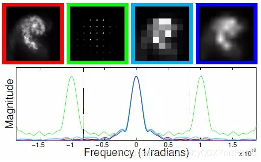 图2 精确的图像频率建模图。可以看到,在相同的参数量情况下,所提出的方法能够得到更加准确的真实频率分布,其中红色部分是真实图像的频率,而传统的离散图像模型用绿色表示,通过矩形和三角脉冲优化后的模型分别用青色和蓝色表示。