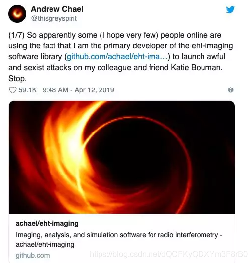不过,就在 Katie Bouman 本人出名后,还出现了一个插曲,在 GitHub 上开源的黑洞算法代码库(https://github.com/achael/eht-imaging)里,她被质疑并非是代码的主要贡献者,而是另一个成员 Andrew Chael。