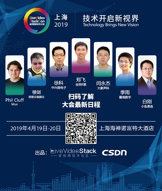 图:扫码了解LiveVideoStack2019上海最新日程。你也可以关注“LiveVideoStack”微信公众号,回复“4.19”,“4.20上午”和“4.20下午”下载大会最新日程。