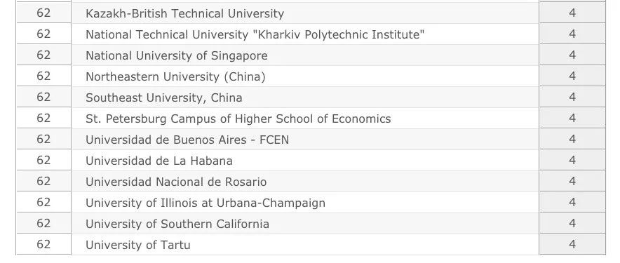 据悉,来自俄罗斯的莫斯科国立大学卫冕成功摘得桂冠。而来自中国的国立台湾大学摘得银牌,排名第五;香港中文大学摘得铜牌,排名第 12。其他入围总决赛的 17 所中国高校分别是:复旦大学、南京大学、北京大学、上海交大、清华大学(并列 13)、北航、浙大、中山大学(并列 21)、华东师范、华南理工、西安交大(并列 41)、北师大、广东工业大学、东北大学、东南大学(并列62) ,此外还有两所高校哈尔滨工业大学、南京理工大学获得荣誉奖。