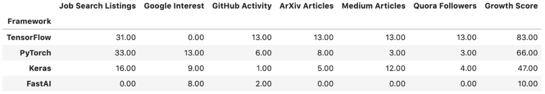 下图展现了各个框架的成长得分: