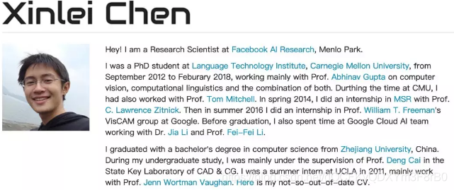 不过这次一作是来自 FAIR 的陈鑫磊博士,虽然和三人组合比起来,一作陈鑫磊还没有那么被大家所熟知,不过其实力也是不容小觑的(毕竟后面跟着三个实力响当当的人物)。营长在陈鑫磊的个人主页上看到他的学习经历和研究成果,也是忍不住点赞。陈鑫磊在浙江大学国家重点实验室 CAD&CG实验室学习时,师从蔡登教授,随后在 CMU 攻读博士学位,现任职于 FAIR,毕业前曾在 Google Cloud 李飞飞和李佳组内实习。在博士研究期间,每年和导师 Abhinav Gupta 教授都有论文发表在 AAAI、CVPR、ECCV、ICCV 等顶会上,考虑篇幅,营长就从每年成果中选一篇列举出来,大家可以前往陈鑫磊的个人主页中可以看到全部作品。