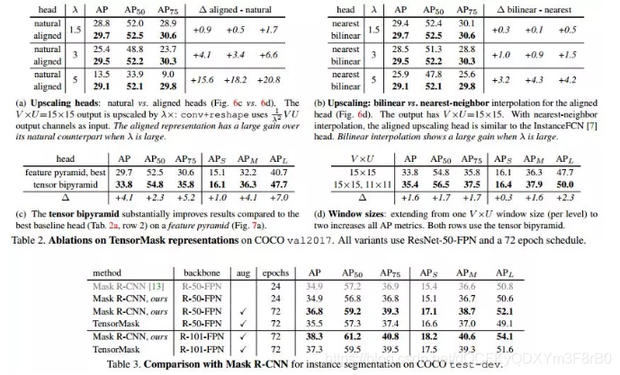 为了说明各分支或者操作的作用,论文做了大量的消融实验来进行论证。具体结果见下图表格的数据以及与 Mask-RCNN 可视化的对比。实验结果证明,TensorMask 能够定性定量的比肩 MaskR-CNN。