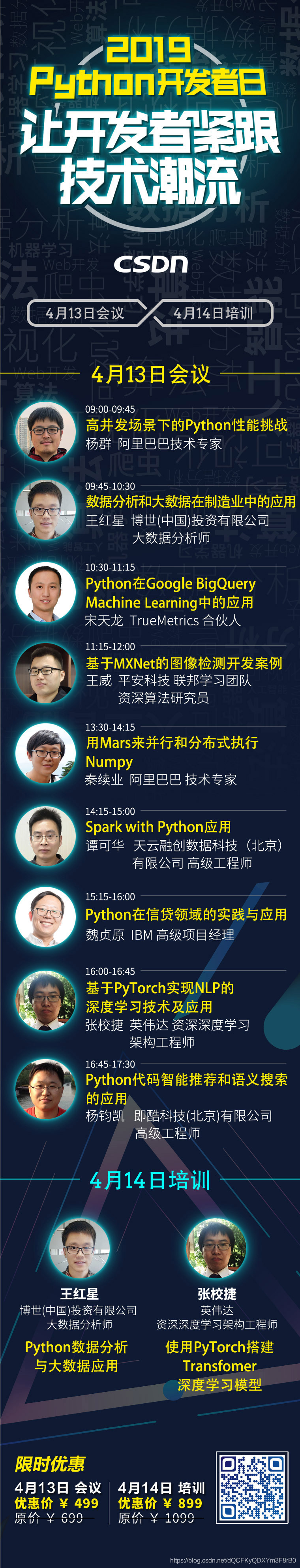 「2019 Python开发者日」7折票倒计时2天!这一次我们依然“只讲技术,拒绝空谈”10余位一线Python技术专家共同打造一场硬核技术大会。更有深度培训实操环节,为开发者们带来更多深度实战机会。更多详细信息请咨询13581782348(微信同号)。