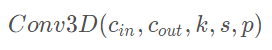 来描述一个卷积中间层,Conv3D表示是三维卷积,cin,cout分别表示输入和输出的通道数,k是卷积核的大小,它是一个向量,对于三维卷积而言,卷积核的大小为(k,k,k);s即stride,卷积操作的步长;p即padding,填充的尺寸。