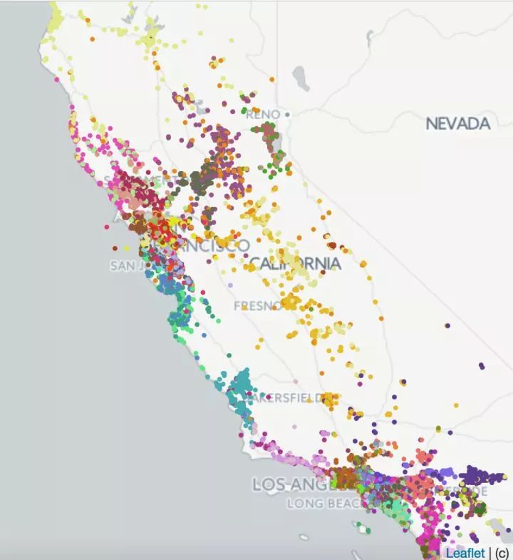 我们用多种方式来评估嵌入捕获到的房源的特征。首先,为了评估地理位置相似性是否被包含,我们对用于学习的嵌入进行了 k 均值聚类 (k-means clustering)。下面的图显示了美国加州产生的 100 个聚类,确认了来自近似位置的房源聚集在一起。 接下来,我们评估了不同类型(整套房源,独立房间,共享房间)和价格范围的房源之间的平均余弦相似性 (cosine similarity) ,并确认相同类型和价格范围的房源之间的余弦相似性远高于不同类型和不同价格的房源之间的相似性。 因此我们可以得出结论,这两个房源特征也被很好的包括在训练好的嵌入中了。