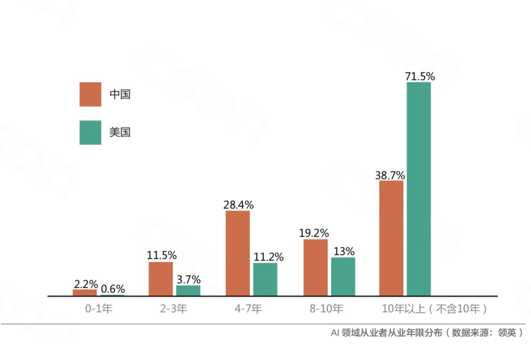 近几年中国的 AI 人才在不断增长,但根据领英的数据,目前中国的高层次 AI 人才还极度缺乏,尤其从业 10 年以上的 AI 人才数量与美国相比有很大差距,并且大多 AI 人才都依赖于海外引进。