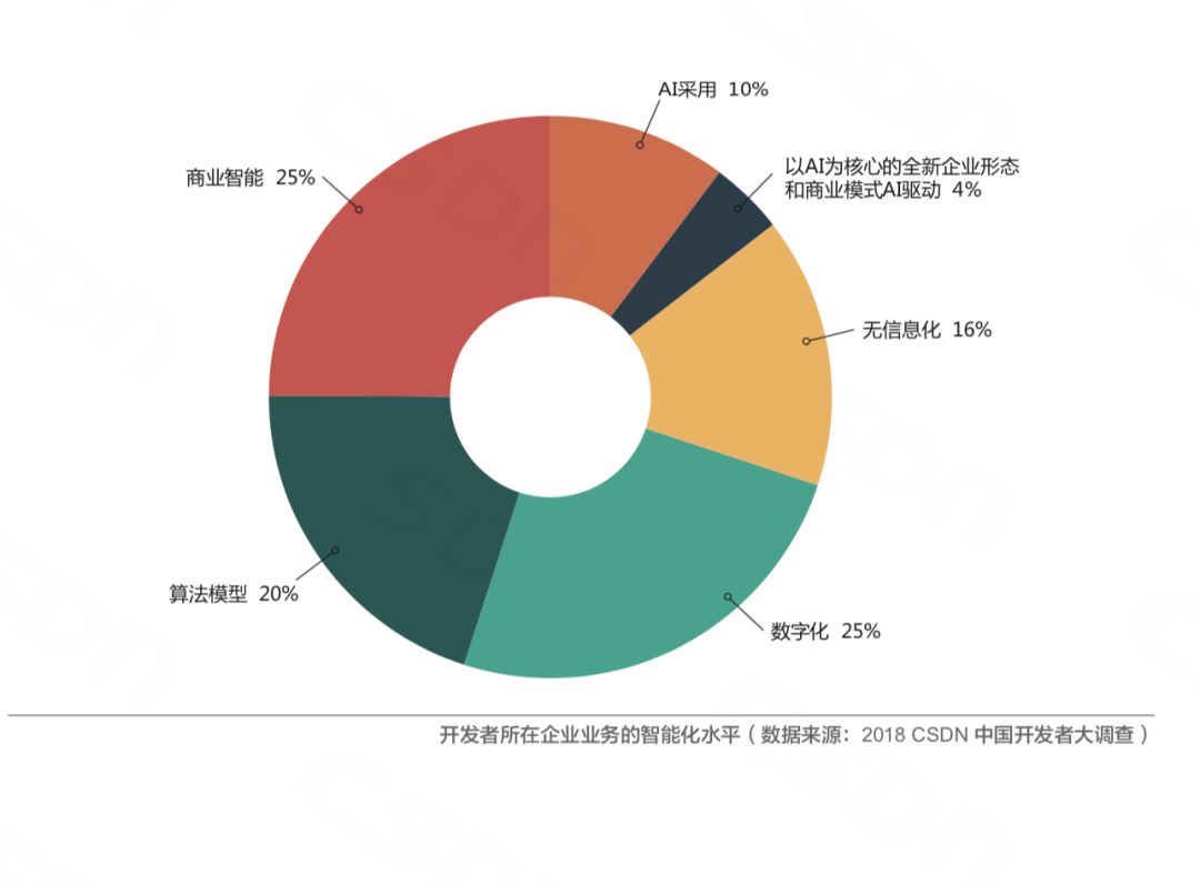 数据显示,目前处于商业智能、数字化、算法模型阶段的公司数量依次居于前三位,而以 AI 驱动的公司数量占比最低为 4%。也就是说,参与调查的开发者所属公司中,绝大部分已经具备了初步 AI 化的能力,但距离围绕 AI 技术构建商业模式这一步还有很远的距离。
