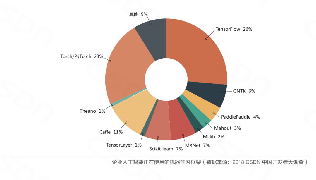 根据图表数据,使用 Torch/PyTorch 的用户已经快要赶上 Tensorflow,而百度的 PaddlePaddle 框架处 于“不温不火”的状态。