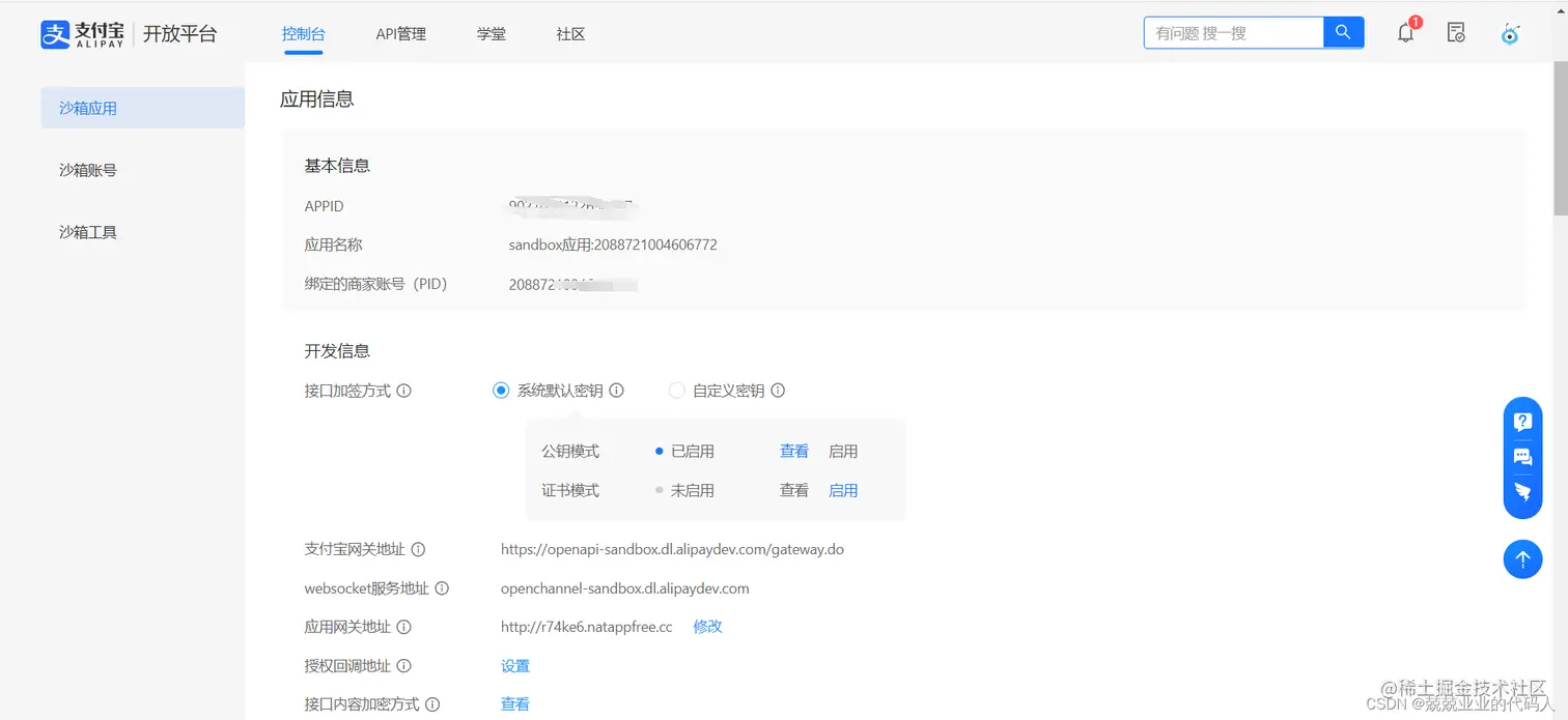 在沙箱进行调试前需要确保已经配置密钥/证书用于加签,支付宝提供了 系统默认密钥 及 自定义密钥 两种方式进行配置。 这里我采取的是默认方式: 开发者如需使用系统默认密钥/证书,可在开发信息中选择系统默认密钥。注意:使用API在线调试工具调试OpenAPI必须使用系统默认密钥。