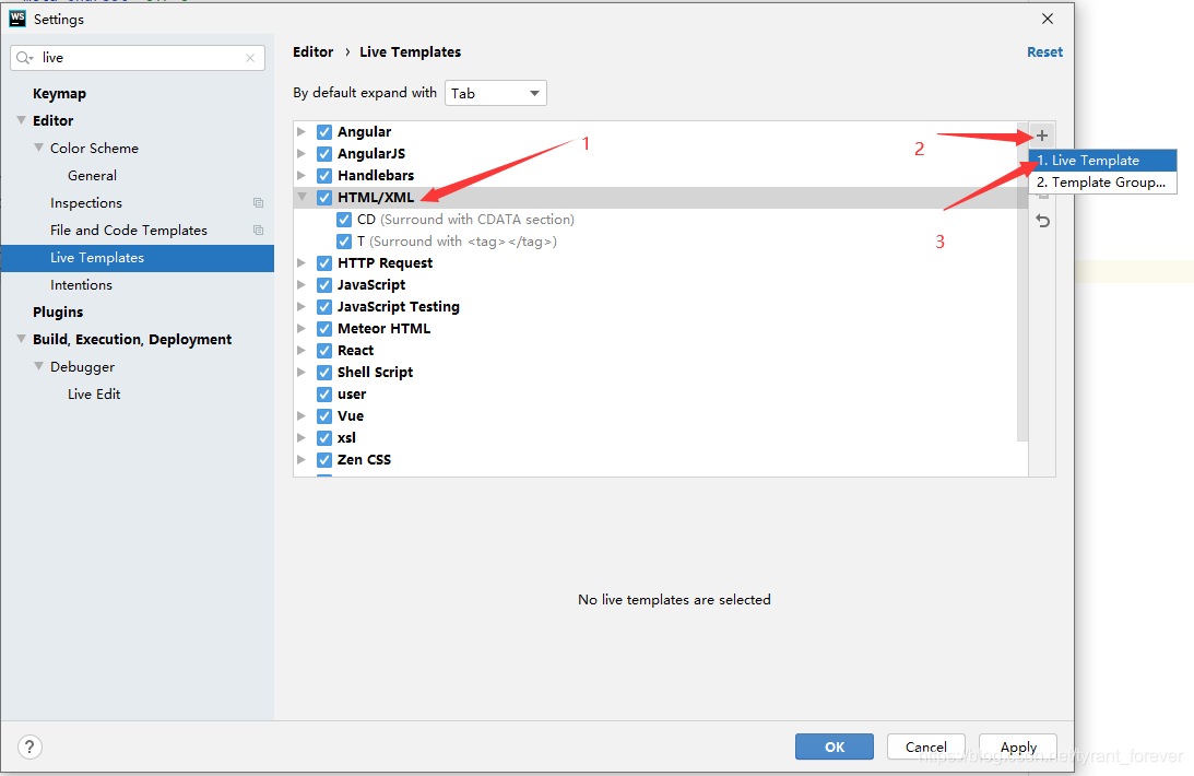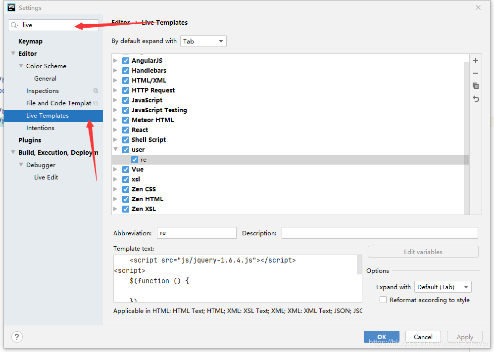 3、在搜索框输入live,点击Live Templates