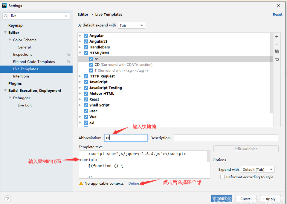 </html>以上面一个jQuery的模板来说,引入jQuery以及写入口函数等操作都是一些机械重复的代码,每一个使用jQuery的文件都要写一遍,那么我们就一这个文件为例,使用快捷键来生成这些机械代码。