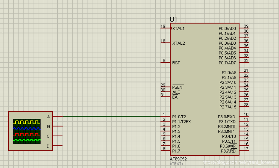 利用Proteus软件画出电路图,单片机定时器/计数器以查询方式工作,在P1.0口产生周期为100us的连续方波,在P1.0口线上接上示波器观察波形。