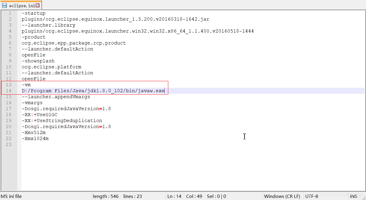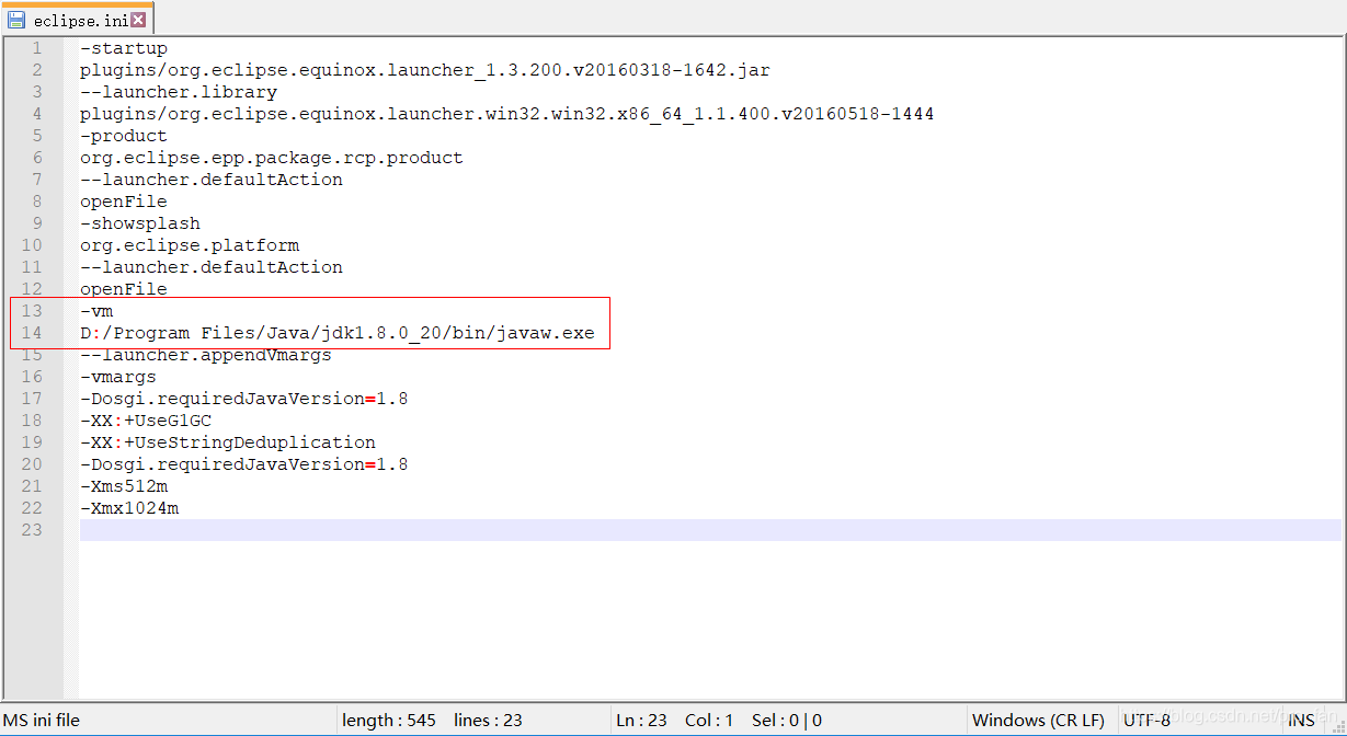打开eclipse.ini文件,也就是启动Eclipse的初始化文件: