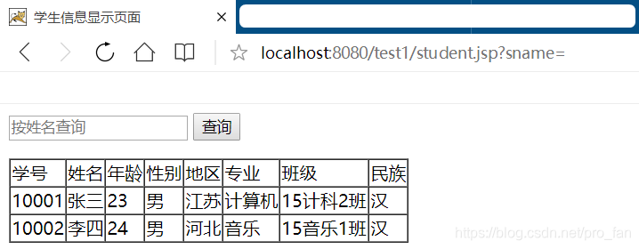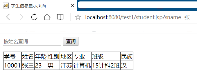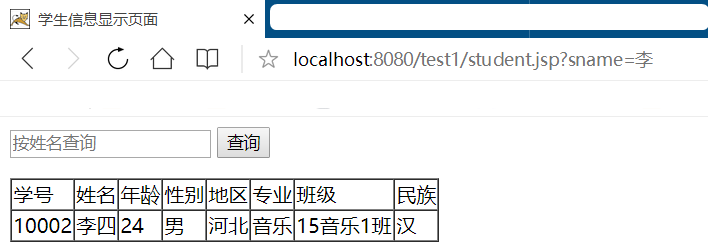 String sname = request.getParameter("sname");String sql = null;if (sname == null) {sql = "select * from student";} else {sql = "select * from student where sname like '%" + sname + "%'";}地址栏访问student.jsp文件(注意观察地址栏变化):