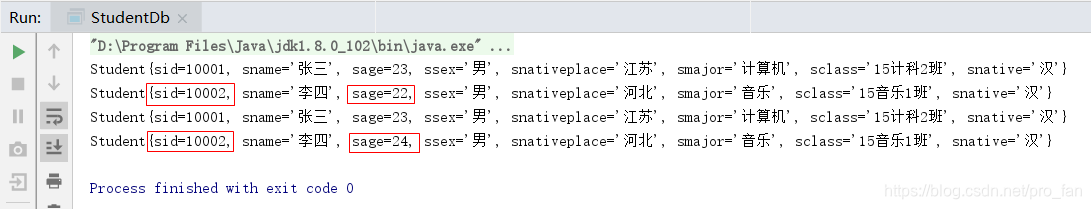 public class StudentDb {//写一个获取mysql数据库连接的函数/*** 函数功能:获取数据库连接对象* @return 返回数据库连接对象* 使用说明:提前知道获取数据库连接对象时所需要的四大参数* 1、驱动类的名称(数据库不同,驱动类的名称不同)* 2、数据库的URL* 3、使用数据库时的用户名* 4、用户名对应的密码* 一定要导入相对应的jar包*/private static Connection getConn(){//第一步:加载驱动类(如果有异常,则抛出异常或者使用try..catch..语句块处理)try {Class.forName("com.mysql.jdbc.Driver");} catch (ClassNotFoundException e) {e.printStackTrace();System.out.println("驱动类加载失败。");/*** 这里可能报错:ClassNotFoundException* 错误原因:可能是驱动类的名称拼写错误,也可能是所需要的jar包没有导入*/}//第二步:获取连接对象String url = "jdbc:mysql://localhost:3306/test";String username = "root";String password = "123456";Connection conn = null;try {conn = DriverManager.getConnection(url,username,password);} catch (SQLException e) {e.printStackTrace();System.out.println("连接对象获取失败。");}//返回一个连接对象return conn;}/*** 函数功能:通过查询语句来获取数据库中的表格信息* @param sql* @return 返回一个List对象* @throws SQLException*/public List<Student> getStudent(String sql) throws SQLException {//查询语句的执行结果为一个表格,即多个学生对象的集合,所有可以创建数组列表对象来存储List<Student> lst = new ArrayList<Student>();//获取连接对象Connection conn = getConn();try {//连接对象conn调用createStatement()方法,创建一个执行SQL语句的对象stStatement st = conn.createStatement();//执行SQL语句的对象st调用executeQuery()方法,执行查询语句,将查询到的结果返回到一个结果集中ResultSet rs = st.executeQuery(sql);//遍历结果集对象while(rs.next()){Student stu = new Student();stu.setSid(rs.getInt("sid"));stu.setSname(rs.getString("sname"));stu.setSage(rs.getInt("sage"));stu.setSsex(rs.getString("ssex"));stu.setSnativeplace(rs.getString("snativeplace"));stu.setSmajor(rs.getString("smajor"));stu.setSclass(rs.getString("sclass"));stu.setSnative(rs.getString("snative"));lst.add(stu);}}catch (Exception e){System.out.println(e.getMessage());}finally {//资源使用完之后,如果没有关闭,则需要关闭if (conn!=null){conn.close();}}return lst;}/*** 函数功能:对表中数据进行增删改操作* @param sql* @return true或者false* @throws SQLException*/public boolean studentUpdate(String sql) throws SQLException {//获取数据库连接对象Connection conn = getConn();try {//连接对象调用createStatement()方法,创建一个执行SQL语句的对象Statement st = conn.createStatement();//执行SQL语句的对象st,调用executeUpdate()方法执行SQL语句,执行结果为int类型,表示受到影响的记录条数//executeUpdate( )方法可以执行增删改DML语句和创建表、删除表等DDL语句int cnt = st.executeUpdate(sql);return cnt>0; //如果有记录受到影响,则表示更新操作成功}catch (Exception e){System.out.println(e.getMessage());return false;}finally {if (conn!=null)conn.close();}}//测试一下public static void main(String[] args) throws SQLException {List<Student> lst = new ArrayList<Student>();lst=(new StudentDb()).getStudent("select * from student");for (Student stu: lst) {//调用Student实体类中的toString()方法,将Student对象转换成字符串输出System.out.println(stu.toString());}boolean tf =(new StudentDb()).studentUpdate("update student set sage=24 where sid = 10002");lst=(new StudentDb()).getStudent("select * from student");for (Student stu: lst) {//调用Student实体类中的toString()方法,将Student对象转换成字符串输出System.out.println(stu.toString());}}