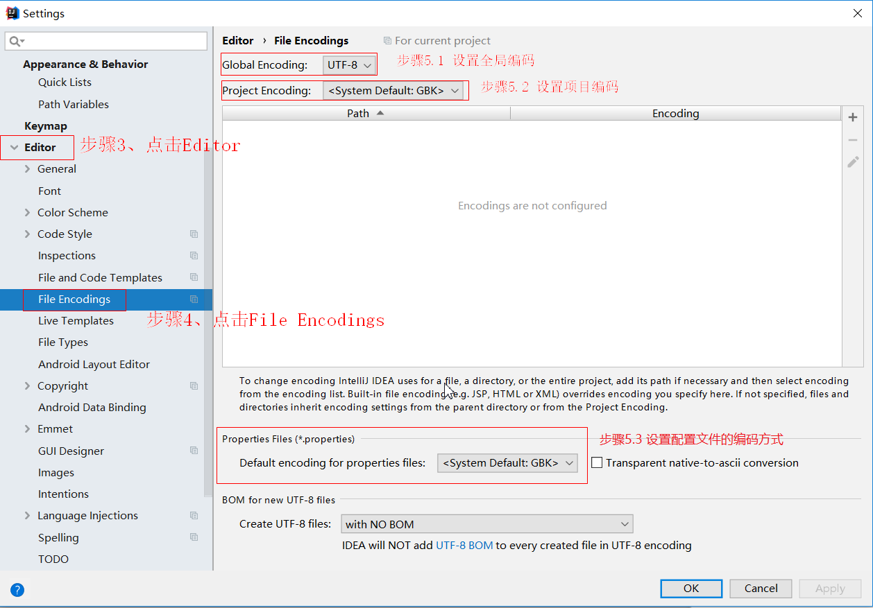如果使用的开发工具是IDEA,则在菜单栏点击【File】,在弹出的窗口中点击【Settings】、【Editor】、【File Encodings】、【修改右侧窗口中相应的编码】 | |