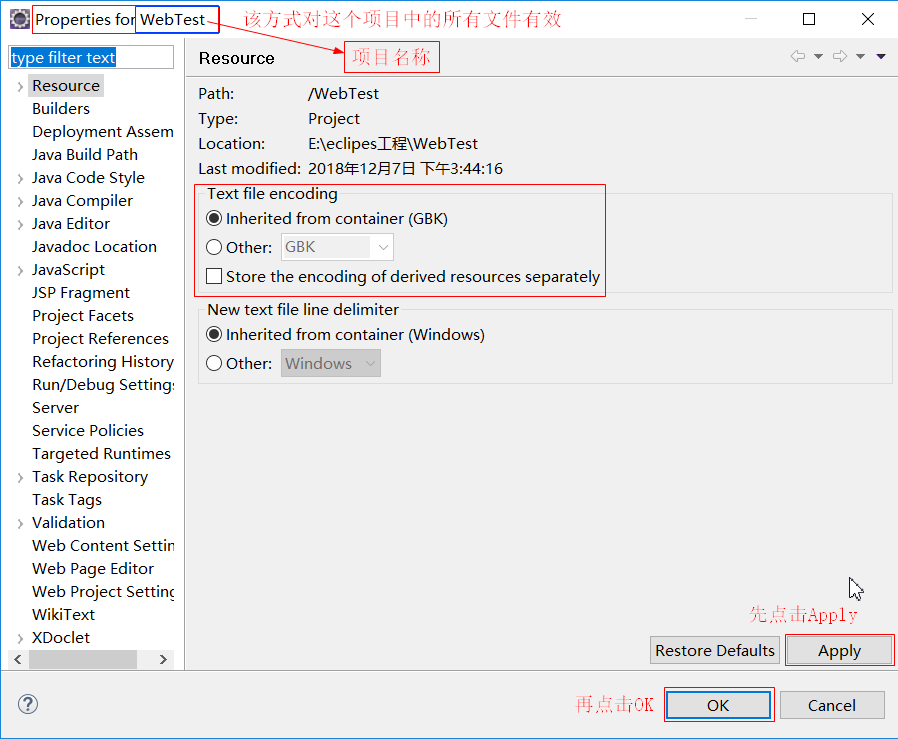 (1)对项目中所有文件设置编码方式 在想要修改编码方式的项目名称上右击,在打开的窗口中点击【Properties】,(或者使用Alt+Enter快捷键),打开如下窗口,在Text file encoding区域设置编码方式,设置完成后,先点击Apply应用,再点击OK; 注意:该方式只对某个具体的项目中的所有文件有效。 |