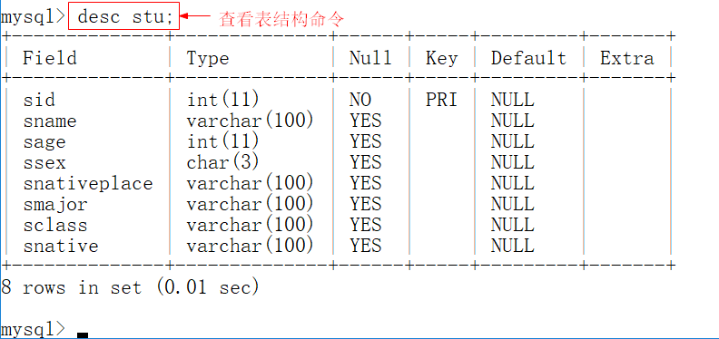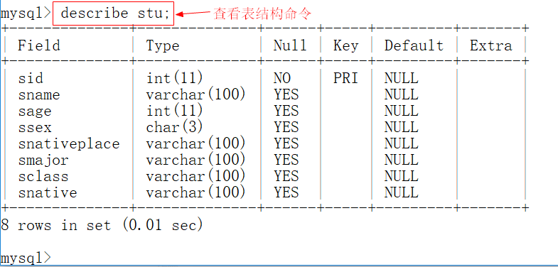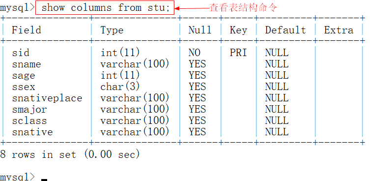 desc table_name;或者describe table_name;或者 show columns from table_name;