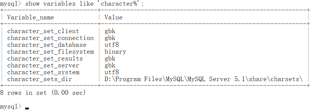 mysql> show variables like 'character%';