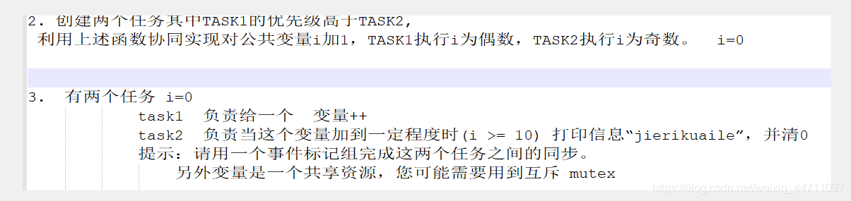 void TaskFunc1(void *tk1){OS_ERR err;while(1){OSFlagPend ((OS_FLAG_GRP *)&EventFlags,(OS_FLAGS)EV_FLAG1,(OS_TICK)0,(OS_OPT)OS_OPT_PEND_FLAG_CLR_ALL|OS_OPT_PEND_BLOCKING|OS_OPT_PEND_FLAG_CONSUME,(CPU_TS*)0,(OS_ERR*)&err);OSMutexPend (&lock,0,OS_OPT_PEND_BLOCKING,0,&err);while(i<=5){printf("I AM TASK 1!DO INC NOW I= %d\r\n",i++);OSTimeDlyHMSM(0,0,1,0,OS_OPT_TIME_PERIODIC,&err);//周期性延迟2秒}OSMutexPost(&lock,OS_OPT_POST_NONE,&err);//向事件标志组EventFlags发送标志flags_num=OSFlagPost((OS_FLAG_GRP*)&EventFlags,(OS_FLAGS )EV_FLAG1,(OS_OPT )OS_OPT_POST_FLAG_SET,(OS_ERR* )&err);OSTimeDlyHMSM(0,0,2,0,OS_OPT_TIME_PERIODIC,&err);//周期性延迟2秒}