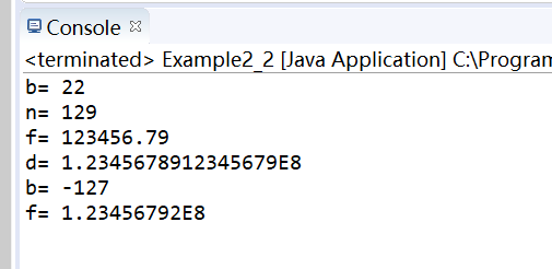 public class Example2_2 {public static void main(String args[]) {byte b = 22;int n = 129;float f = 123456.789f;double d = 123456789.123456789;System.out.println("b= "+b);System.out.println("n= "+n);System.out.println("f= "+f);System.out.println("d= "+d);b = (byte)n;f = (float)d;System.out.println("b= "+b);System.out.println("f= "+f);}}