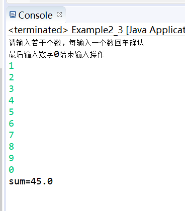 package java_chapter02;import java.util.Scanner;public class Example2_3 {public static void main(String args[]) {System.out.println("请输入若干个数,每输入一个数回车确认");System.out.println("最后输入数字0结束输入操作");Scanner reader = new Scanner(System.in);double sum = 0;double x = reader.nextDouble();while(x!=0) {sum = sum+x;x = reader.nextDouble();}System.out.println("sum="+sum);}