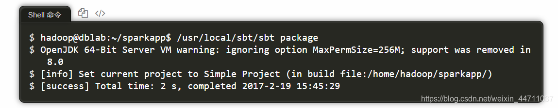 /usr/local/sbt/sbt package对于刚安装好的Spark和sbt而言,第一次运行上面的打包命令时,会需要几分钟的运行时间,因为系统会自动从网络上下载各种文件。后面再次运行上面命令,就会很快,因为不再需要下载相关文件。