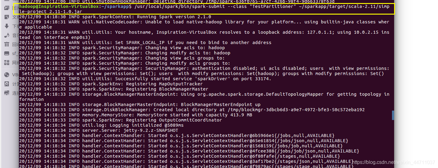 生成的 jar 包的位置为 ~/sparkapp/target/scala-2.11/simple-project_2.11-1.0.jar。