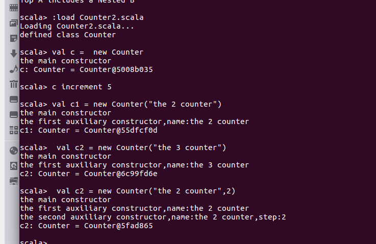 printf("the second auxiliary constructor,name:%s,step:%d\n",name,step)}def increment(step: Int): Unit = { value += step}def current(): Int = {value}